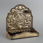 Latoenkoperen chanoekia met decor: bloemen met centraal een Hebreeuwse spreuk, 18e eeuw, 28 × 25 × 9 cm