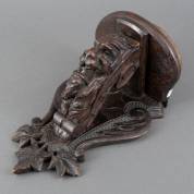 Eiken wandconsole gedecoreerd met een leeuwenkop, de achterplaat met wijnrankdecor, 19e eeuw -beetje slijtage- 35 × 21 cm