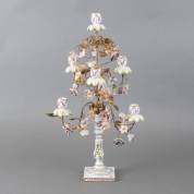 Zevenlichts koperen kandelaber op porseleinen voet met porseleinen bloemen, uitvoering Capodimonte, Napels, Italië, 19e eeuw -chip aan balustervormig onderdeel van de stam-, 58 cm
