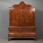 Noten- en wortelnotengefineerd tweedeurs kabinet met gecontourneerde kap, vier laden met brons beslag, midden 18e eeuw -fineerverlies en defecten, achterzijde verstevigd met twee regels-, 250 × 175 × 58,5 cm