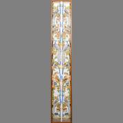Rechthoekig tegeltableau voorstellende: twee zuilen met bloemenranken, pauwen en papegaaien, 26 tegels gelijmd op houten drager -defecten aan tegels maar constructie stevig-, 172 × 28 cm