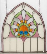Toogvormig glas-in-lood raam, fragment van groter geheel, 20e eeuw -lood verbogen bij ophangpunten-, 80 × 70,5 cm