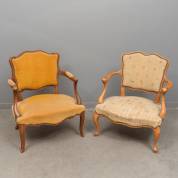 Twee diverse beuken damesfauteuiltjes met verschillende bekleding, 20e eeuw