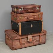 Vier oude reiskoffers, waarvan drie uitgevoerd in leder -intensief gebruikt-, grootste 33 × 82 × 47 cm
