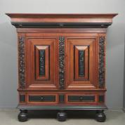 Eiken rankenkast met gezwart houten accenten, het interieur met twee ajourgezaagde deuren, staande op drie gezwarte bolpoten -samengesteld, diverse gebruikssporen en houtwormsporen-, 206 × 204 × 69 cm