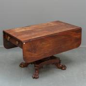 Mahonie hangoortafel met onder het blad één lade, eerste helft 19e eeuw -politoer blad erg sleets-, maat ingeklapt 64 × 106 × 57 cm, uitgeklapt 106 × 113
