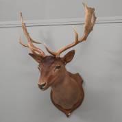 Opgezette kop met gewei van een damhert, op houten wandplaat, circa 85 × 65 × 50 cm