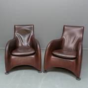 Paar bruin lederen fauteuils, model Loge, ontwerp Gerard van den Berg, uitvoering Montis, modern