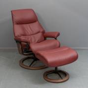 Relaxfauteuil met steenrode lederen bekleding en voetenbank, uitvoering Stressless