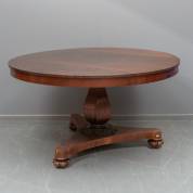 Ronde mahonie tafel op gehoekte balustervormige poot met gesneden decor rondom, staand op driespantpoot, 19e/20e eeuw -gebruikssporen-, 78 × Ø 128 cm