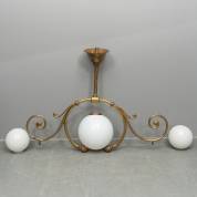 Plafondlamp met messing montuur en drie opalineglazen bollen -montage bollen incompleet-, afmetingen messing montuur 87 × 118 cm