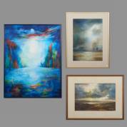 Dorothea Brähler-Kühnen (1906-1997), geabstraheerd landschap met zon, olieverf op doek, r.o. gesigneerd, 90 × 70 cm, daarbij: twee werken op papier, landschappen, beide r.o. gesigneerd, 31,5 × 47 cm