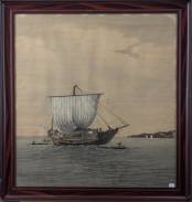 Ingelijste gobelin: junk met diverse kleine bootjes, 20e eeuw -wat vergeeld-, 58 × 54 cm