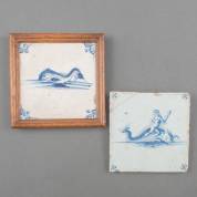 Twee Delfts aardewerk tegels: één met blauw-wit decor van zeewezen, ingelijst -de hoeken bijgeschilderd-, de ander met zeewezen en figuur -beschadigingen, gelijmde hoek-, 17e/18e eeuw, 13 × 13 cm