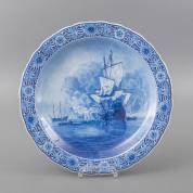 Delfts aardewerk schotel met blauw-wit decor 'Het kanonschot', naar Willem van de Velde, schilders W.M.G. ten Hacken en A. Mak, uitvoering De Porceleyne Fles, 1953, Ø 40 cm