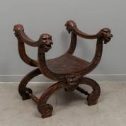 Notenhouten taboeret in de vorm van een dagobertstoel met mascarons, neorenaissance, 63 × 59 × 61 cm