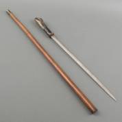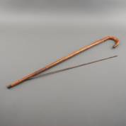 Houten wandelstok met zwaard en hoornen greep in de vorm van een papegaai, messing ferrule, 19e eeuw, lengte 93 cm