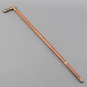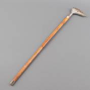 Houten wandelstok met uitklapbare zaag welke kan worden vastgezet met een veersluiting aan de kop van de greep, messing ferrule en slot, gemerkt: Holzapfel & Co., London, circa 1890, lengte 96 cm