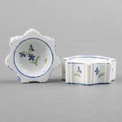 Paar gecontourneerde porseleinen zoutschaaltjes met korenbloemdecor, uitvoering Niderviller, Frankrijk, 1774-1789 -vele randchipjes-, 2,7 × Ø 6,5 cm