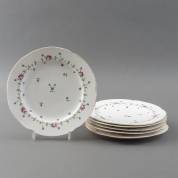 Zes Amstel porseleinen borden met polychroom decor van korenbloemen en rozen, gemerkt Amstel in onderglazuur blauw en diverse ingekerfde merktekens, circa 1800 -alle met chips en randslijtage, enkele haarlijnen-, Ø 25,9 cm