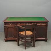 Mahonie bureau met groen vilten werkblad, daaronder negen lades met rijk gesneden decor, circa 1900, 77 × 159,5 × 91 cm, daarbij: bureaustoel met rietbespannen zitting, circa 1920