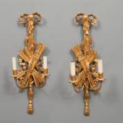 Paar vergulde houten tweelichts wandappliques met pijlenkokerdecor, Louis Seize-stijl, 20e eeuw -schroefgaatje onderin-, 62 × 24 × 13 cm
