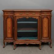 Mahonie breakfront buffetkast met twee dichte deuren en centraal een glazen deur waarboven drie laden, geheel met gesneden vergulde ornamenten, de twee deurtjes met inlegwerk, 19e eeuw -krassen en vlekken op bovenblad-, 121 × 158 × 44 cm