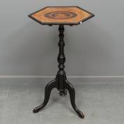 Gezwart houten tilt-top bijzettafel op driespantpoot, het hexagonale blad met inlegwerk van dansend paar in medaillon, Hollands, 19e eeuw -kleine defecten aan inlegwerk, pootjes wat instabiel-, 73 × 39 × 47 cm