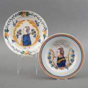 Twee Delfts aardewerk orangistenborden, één met decor van Prins Willem V en tekst: 'Siet wat hier van agteren staat' en aan achterzijde: 'Bit voor u vorst wenst hem geen kwaat', het andere bord met beeltenis van zijn zoon, Willem Frederik, gemerkt Lampetkan, laatste kwart 18e eeuw, Ø 23,5 cm