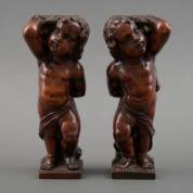 Paar notenhouten putti, te gebruiken als zuiltjes, 18e eeuw, hoogte 24 cm