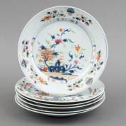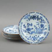 Zes Chinees porseleinen borden met blauw-wit floraal decor in een rolschildering, eerste helft 18e eeuw -enkele randchips-, Ø 23 cm