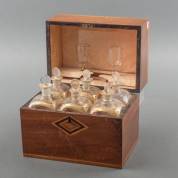 Mahonie likeurkelder met ruitvormig inlegwerk, het interieur met zes goudbeschilderde glazen karaffen en twee glaasjes, circa 1800 -gebruikssporen-, 23 × 25 × 17,5 cm