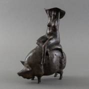 Evert den Hartog (1949), naakte vrouw met hoed en kussen op varken, gepatineerd brons, achterop gemonogrammeerd EH, 27 × 19 × 8 cm