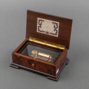 Houten muziekdoosje, het deksel ingelegd met decor van muziekinstrumenten met bladmuziek, uitvoering Reuge Music, Zwitserland, 1994, met certificaat, 7 × 17,5 × 12 cm
