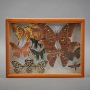 Doos met geprepareerde vlinders, waaronder: Attacus Atlas, Actias Maenas en de Urania Leilus, 40 × 30 × 5 cm