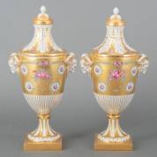 Paar porseleinen kastanjevazen met gouddecor en polychroom beschilderd met boeketten en guirlandes, gemerkt met (pseudo) Sèvres merk, hoogte 39 cm