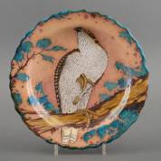 Plateel 'unique metallique' wandschotel met decor van een roofvogel, schilder J.W. van Schaik, uitvoering Plazuid, Gouda, Ø 30 cm