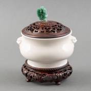 Chinees blanc de Chine wierookbrander met leeuwenmascarons, de gesneden houten deksel met jade knop, staand op houten basement, Dehua, 18e/19e eeuw -knop gelijmd-, Ø 13 cm