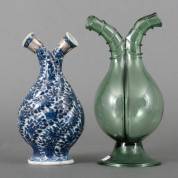 Chinees porseleinen getorst olie- en azijnvaasje met blauw-wit floraal decor, beide halsjes met zilveren monturen, gemerkt met artemisiablad, Kangxi -beide halsjes onder monturen gerestaureerd, één hals bij aanzet gerestaureerd, breuklijntje tussen de halsjes-, 19 × 10 × 8 cm, daarbij: gelijkend Venetiaans groenglazen olie- en azijnvaasje, 20e eeuw, 22 × 11 × 9 cm