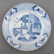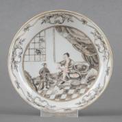 Chinees porseleinen schoteltje met encre de Chine bordeeldecor: vrouw knipt haar nagels naast bediende met handdoek, 18e eeuw, Ø 11,5 cm