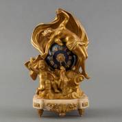 Verguld bronzen beeldpendule: de dageraad, adres: Victor Boudet, 43 Boulevard des Capucines, Parijs, eind 19e eeuw -uurwerk defect- 21 × 13 × 10 cm