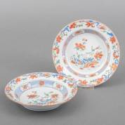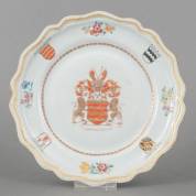 Chinees porseleinen Chine de Commande gecontourneerd dubbelbord met centraal het wapen van de familie Van Hardenbroek geflankeerd door twee leeuwen, langs de rand vier wapens van Van Hardenbroek, Van Reede, Van Eeden en Van Varick, Qianlong -randchips, haarlijn-, Ø 26 cm