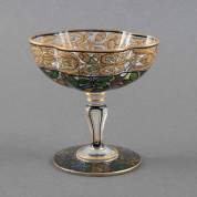 Kleine glazen bokaal op voet met goudkleurig en gekleurd glasemail decor, genummerd 120/327, de beschildering is toe te schrijven aan Hermann Pautsch of Julius Mühlhaus, Haida, Tsjechië, begin 20e eeuw, hoogte 11 cm