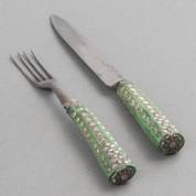Couvert met groene octagonale heften, ingelegd met zilveren rozetjes, vogeltjes en bladeren, het mes op het lemmet gemonogrammeerd AK, 18e eeuw, lengte mes 22 cm