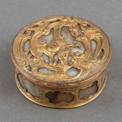 Rond parelmoer doosje met scharnierend deksel, geheel gevat in opengewerkt verguld messing montuur met reliëfdecor: personificatie van de meetkunde tussen rocailles, derde kwart 18e eeuw, 3 × Ø 6,5 cm