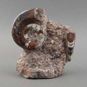 Fossiel: gepolijste ammoniet en orthoceras in gesteente, totale grootte 24 × 23 × 8 cm