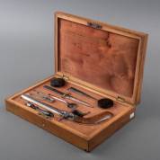 Achterlader pistool in presentatiekoffer, het pistool is met draaibare grendel te bedienen door de trekkerbeugel te draaien, de kolf met onduidelijk octrooimerk, daarbij: deels verguld mesje, loodpannetje, kogelmal, en twee opslagdoosjes, tweede helft 19e eeuw, doos 6 × 31,8 × 20,6