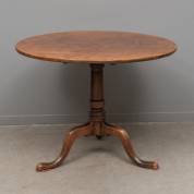 Ronde eiken tilt-toptafel op driespantpoot, Engeland, 18e/19e eeuw -gebruikssporen-, 71 × Ø 93 cm