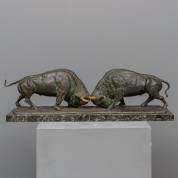 Bronzen beeld: twee vechtende bizons, gepatineerd brons, gesigneerd M. Bauer, op groen marmeren basement -één hoorn gelijmd-, 27 × 86 × 17 cm inclusief basement