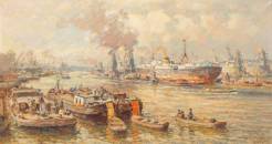 Evert Moll (1878-1955), groot formaat havengezicht van Rotterdam, olieverf op doek, r.o. gesigneerd, 100 × 184 cm